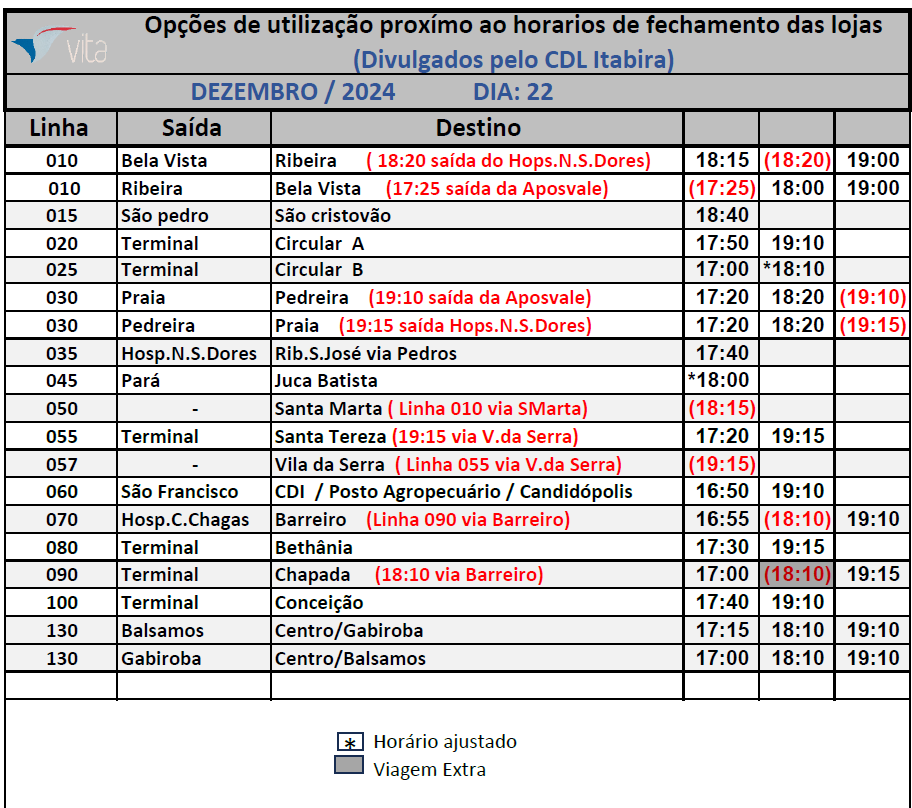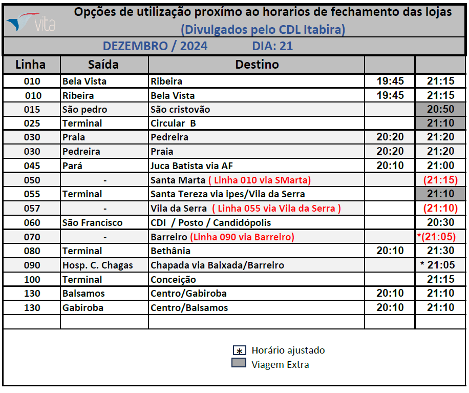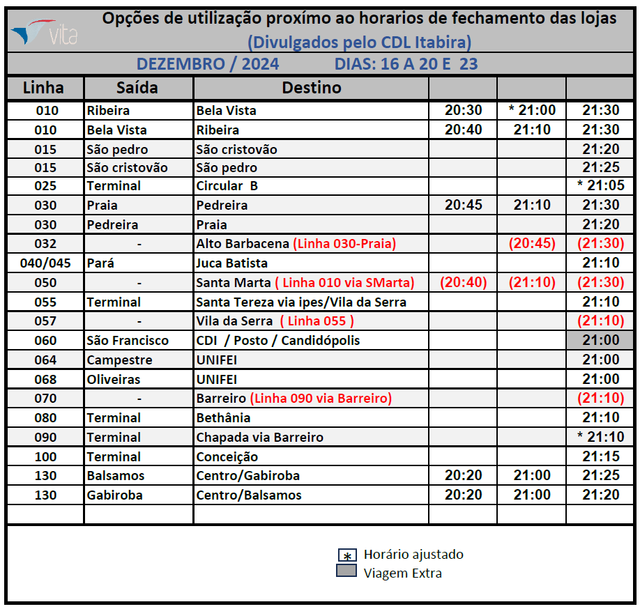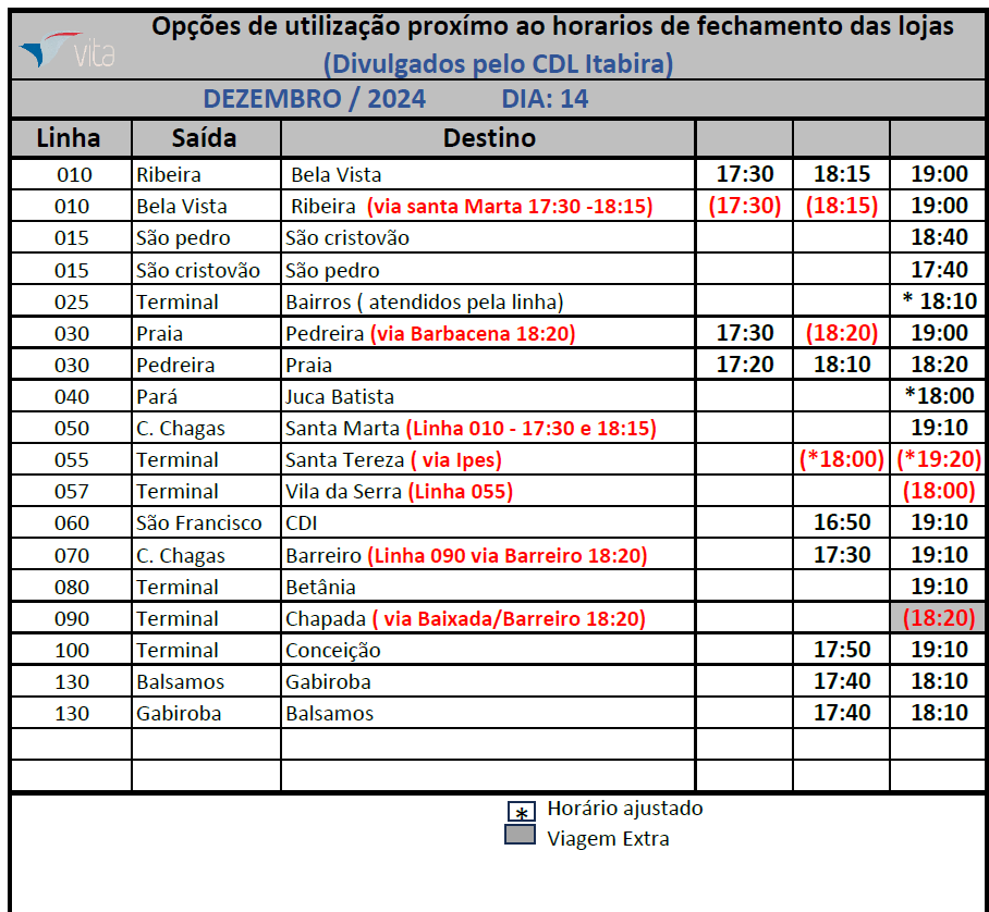 Segue abaixo a programação das linhas, com opções de utilização próximos ao horários de fechamento das lojas do comercio de itabira, para o dia 14/12/2024 e 16/12/2024 a 23/12/2024.